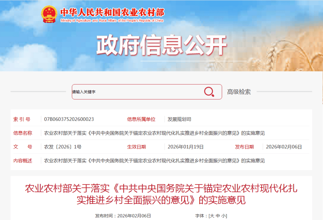 2026年做为“十五五”开局之年,“三农”工做被提到主要高度。近日,2026年地方一号文件的总体,正在农业农村部最新发布的实施看法中,已细化为面向行业的“施工图”。