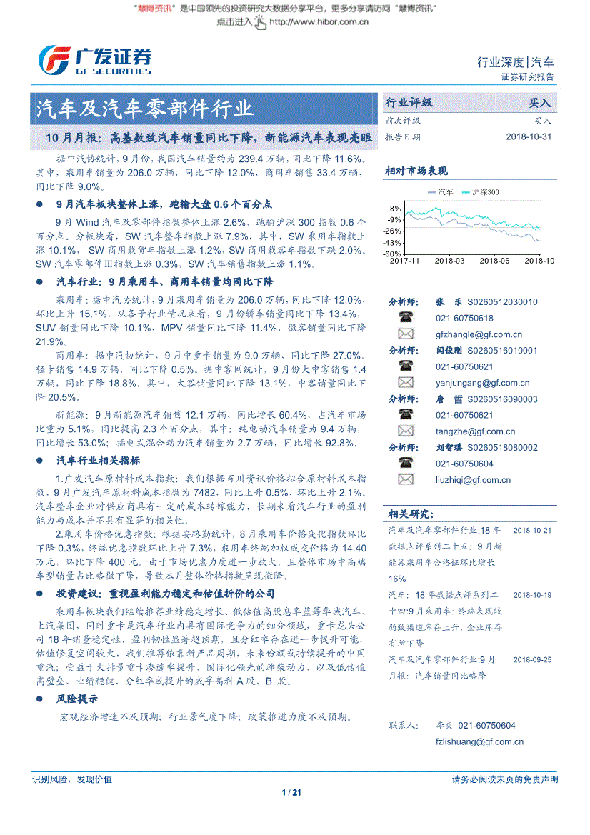 (慧博投研资讯)此中,乘用车销量为206。0万辆,同比下降12。0%,商用车发卖33。4万辆,同比下降9。0%。(慧博投研资讯)9月汽车板块全体上涨,跑输大盘0。6个百分点9月Wind汽车及零部件指数全体上涨2。6%,跑输沪深300指数0。6个百分点。分板块看,SW汽车整车指数上涨7。9%,此中,SW乘用车指数上涨10。1%,SW商用载货车指数上涨1。2%,SW商用载客车指数下跌2。0%。SW汽车零部件Ⅲ指数上涨0。3%,SW汽车发卖指数上涨1。1%。
